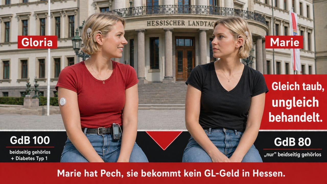– Die eine (Gloria) hat zusätzlich eine andere Behinderung, hier Diabetes Typ 1 → GdB 100 → Anspruch auf Gehörlosengeld
